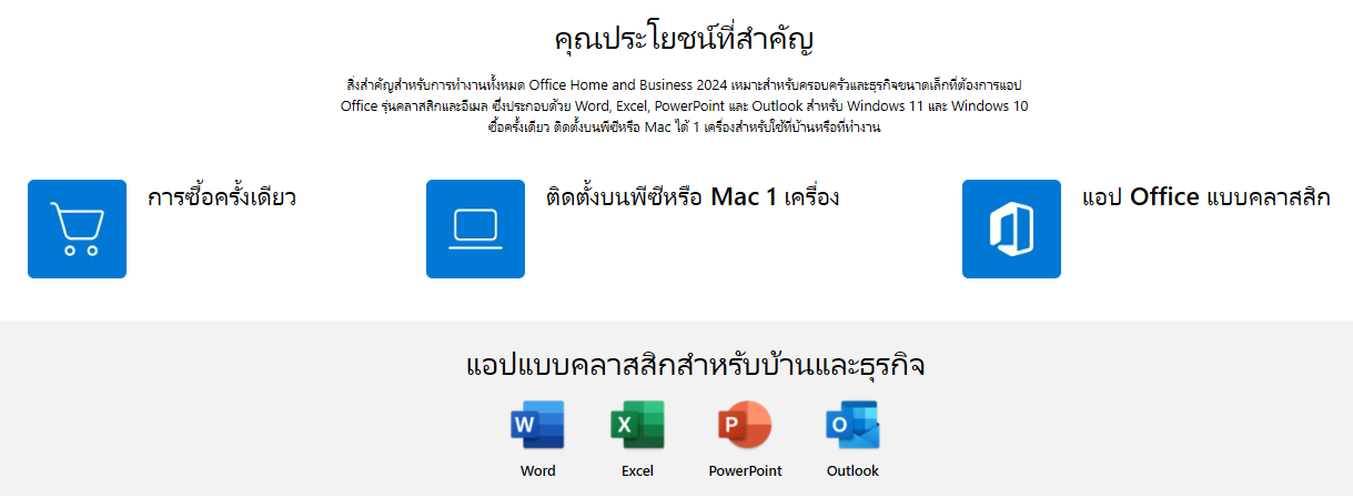Microsft Office Home & Business 2024 (FPP) EP2-06630 • การซื้อครั้งเดียวสำหรับพีซีหรือ Mac 1 เครื่อง • เวอร์ชัน 2024 คลาสสิกของ Word, Excel, PowerPoint และ Outlook • รวมการเข้าถึงของทรัพยากรสนับสนุน • สิทธิ์การใช้งานสำหรับการใช้งานภายในบ้านและเชิงพาณิชย์ สามารถใช้งานร่วมกับ Windows 11 หรือ macOS *ไปที่ aka.ms/systemrequirements สำหรับ Windows 11 Windows 10 และ macOS เวอร์ชันที่ใช้งานได้และข้อกำหนดฟีเจอร์อื่นๆ |